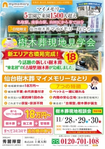 お知らせ 2025年05月 マイメモリー大和の杜 【新区画完成!】 本日は、マイメモリー樹木葬新区画のお知らせです。 この度、マイメモリー樹木葬仙台北大和の杜にて、 新しく個別区画が完成!いたしました。 ... 詳細を見る